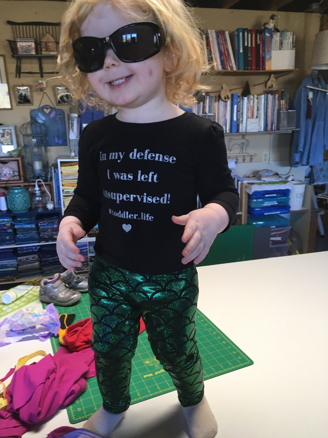 Now looking at the name of the pattern you may do a double take. “Peg Legs?!” You may ask. The name of the Pattern company is Patterns for Pirates, they quite often name their patterns with a pirate theme. Peg Legs are a basic legging pattern. The also have a Jolly Rodger Raglan for kids (raglan style t-shirt) which is my favourite t-shirt pattern for my toddler. They also have a dress called Me Hearties (which has a twirl worthy circle skirt my daughter loves!) You get the idea. Great every day clothes, (some formal clothes too) fun names.