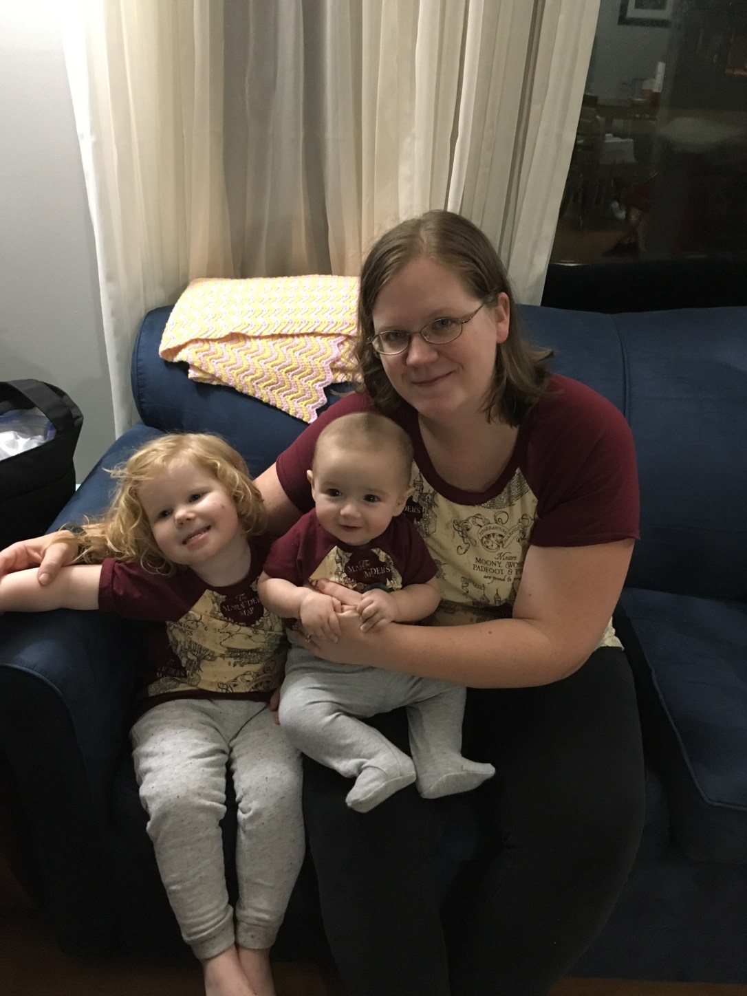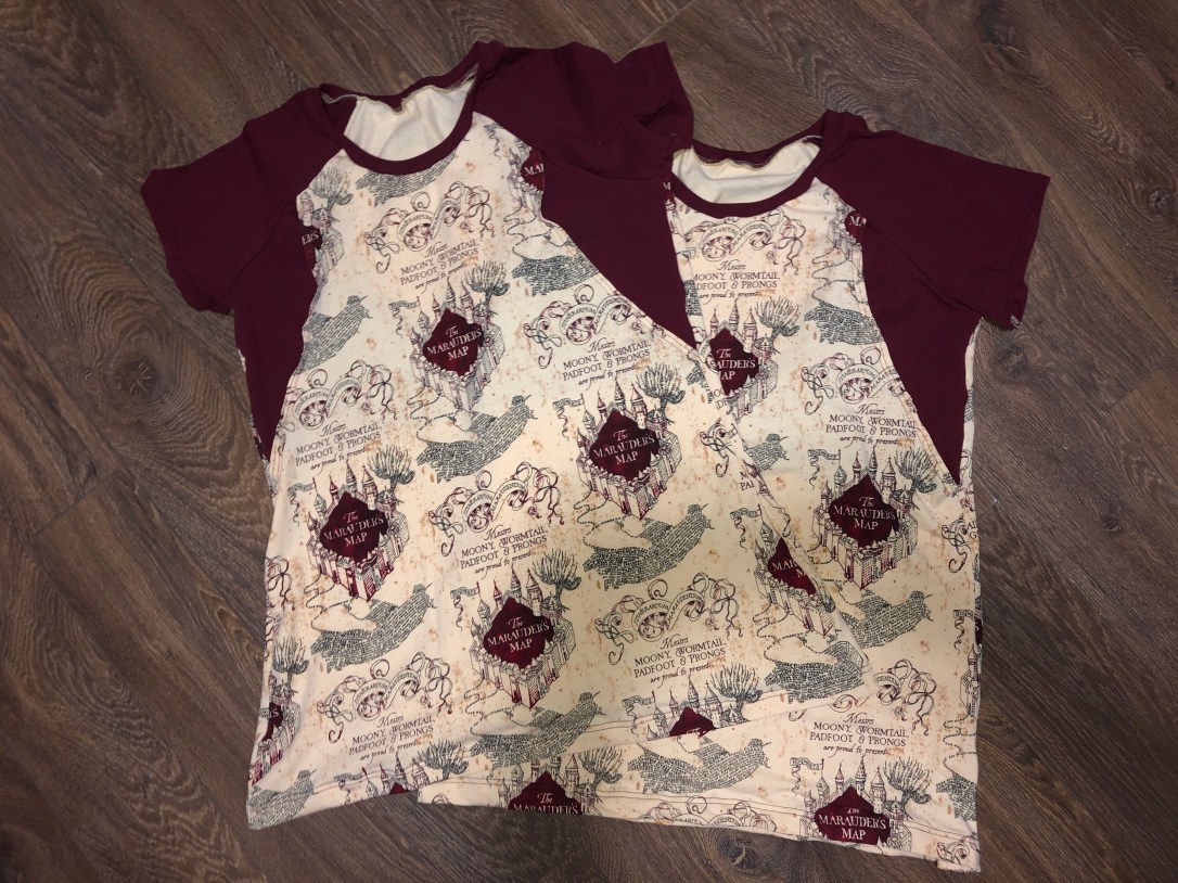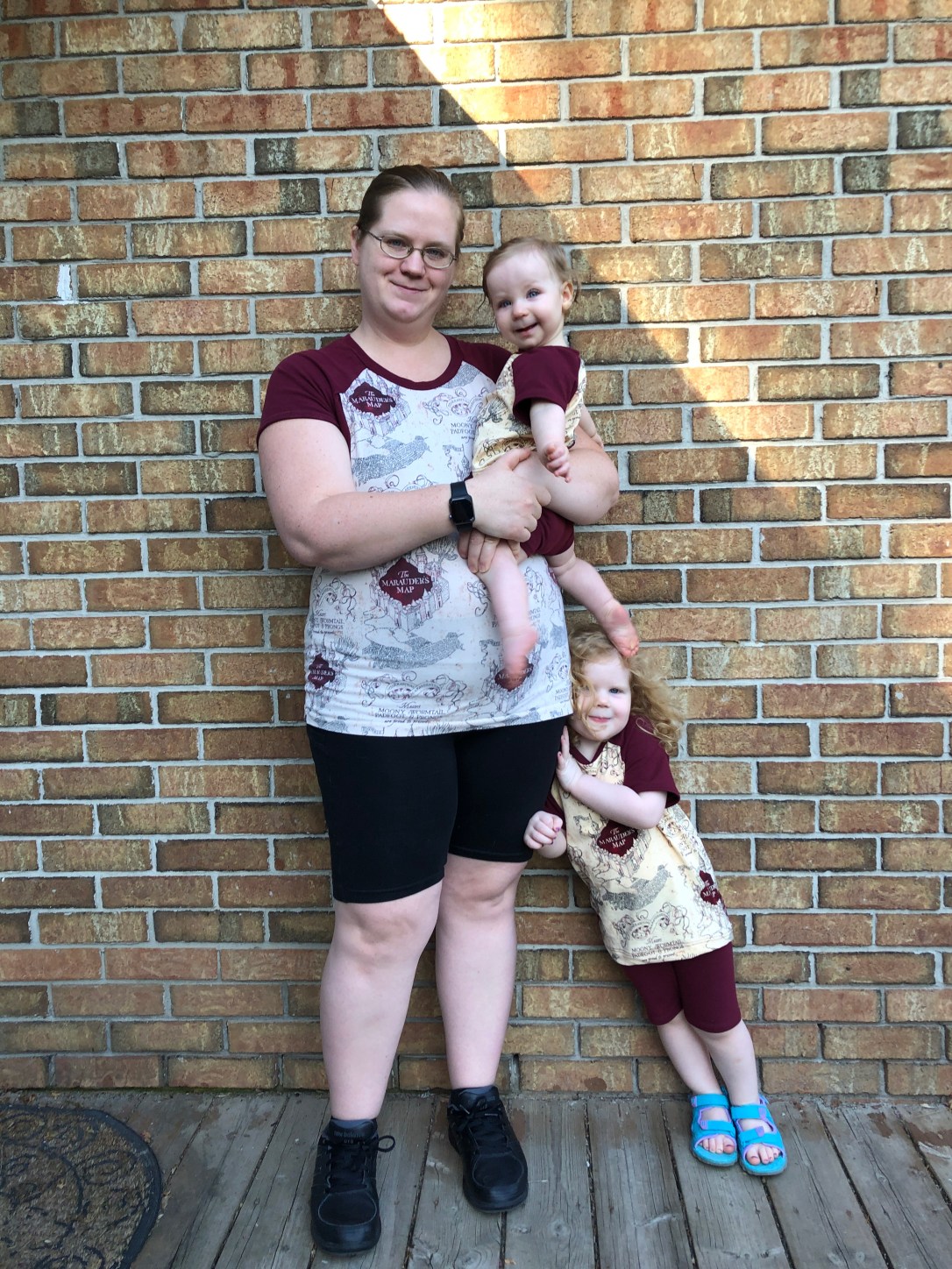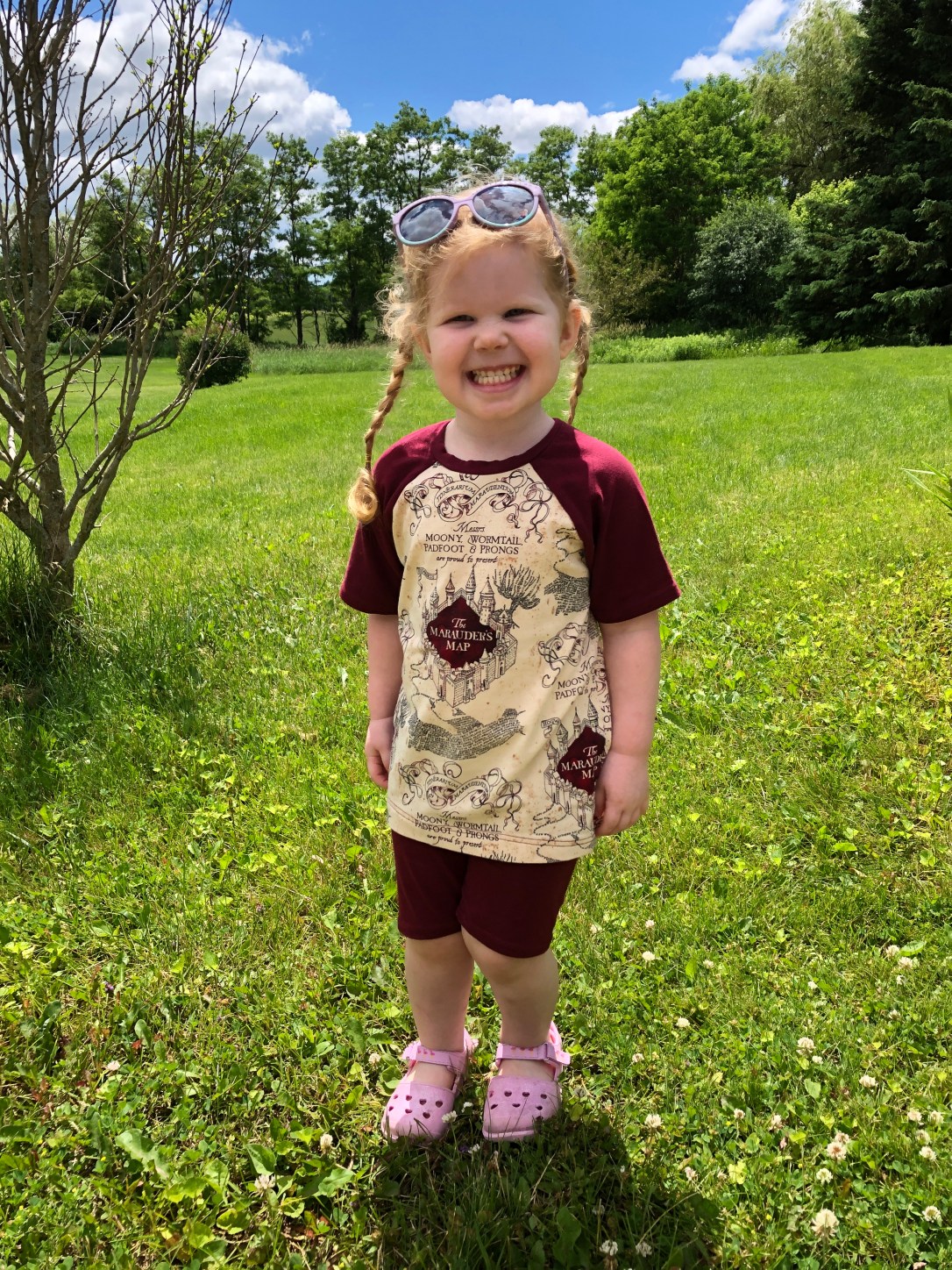 By the time my friends had their second baby, the kids had outgrown (or were starting to outgrow) the first set of shirts I made, so it was time to make more! I made each of the four kids a full set this time. Each got a Maurader’s Map Jolly Rodger Raglan with burgundy sleeves and matching burgundy shorts (either Petite Pegs by Patterns for Pirates or Bonny Leggings by Made for Mermaids, depending on the size). You can find my post about the shorts pattern here.